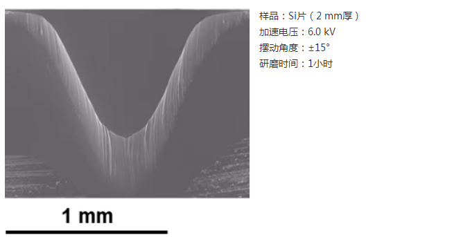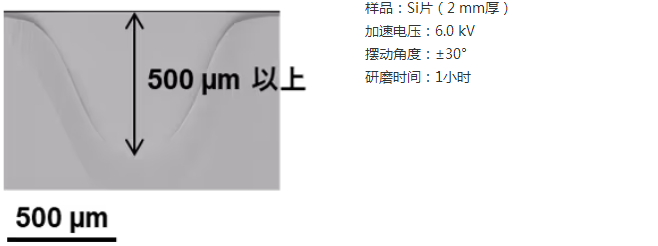 截面研磨時如果擺動的角度發(fā)生變化,加工的寬度和深度也會發(fā)生變化。下圖為Si片在擺動角度為±15°下進(jìn)行截面研磨后的結(jié)果。除擺動角度以外,其他條件與上述加工條件一致。通過與上面結(jié)果進(jìn)行對比后,可發(fā)現(xiàn)加工的深度變深。
