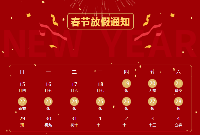 一、放假時間從2023年1月19日—2023年1月28日,共計十天,1月29日(正月初八)正式上班;