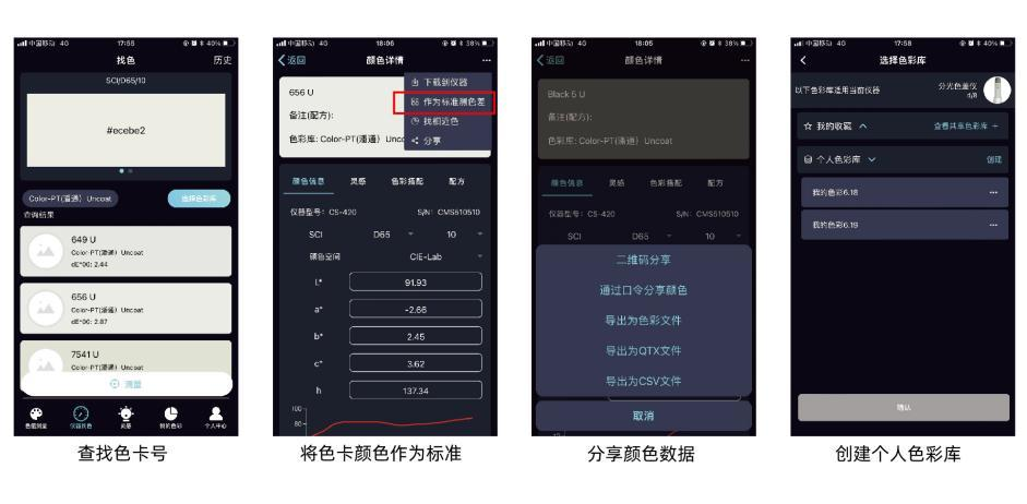 用戶可以創(chuàng)建個人色彩數(shù)據(jù)庫,錄入印刷、涂料、紡織等色卡信息,創(chuàng)建的色彩庫可上傳至云端,多設(shè)備數(shù)據(jù)共享。