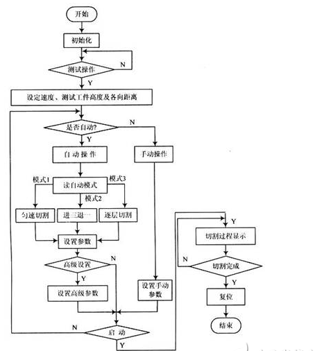 在啟動(dòng)切割之前,需要對(duì)相應(yīng)的切割工藝參數(shù)進(jìn)行正確設(shè)置。其中,自動(dòng)操作包括三種模式(勻速切割、進(jìn)三退一切割、逐層切割),每種模式根據(jù)具體需要還可以設(shè)置相應(yīng)的高級(jí)設(shè)置選項(xiàng)和加密操作選項(xiàng),在方便操作的同時(shí)增強(qiáng)了安全性。