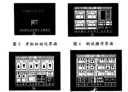 該系統(tǒng)觸摸屏界面的開(kāi)發(fā),使用了專(zhuān)用組態(tài)工具EasyBuilder500。開(kāi)發(fā)的各界面如圖3所示。當(dāng)系統(tǒng)上電后,觸摸屏啟動(dòng)初始化界面,點(diǎn)擊“進(jìn)入”按鈕,輸入密碼,驗(yàn)證正確后即可選擇下方三種操作。圖4~圖6分別為三種操作界面的示意圖。
