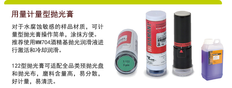 對(duì)于水敏感材質(zhì)的高效拋光,拋光膏是一個(gè)常見選擇,根據(jù)對(duì)水接觸的控制要求可以使用702型或者704型潤(rùn)滑冷卻劑配套使用。122型拋光膏可適配全品類預(yù)拋光盤和拋光布,磨料含量高,亦分散,好計(jì)量,易清洗。 |