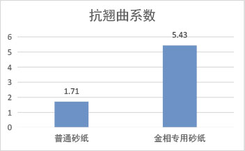 抗翹曲性測試:將砂紙安裝在磨拋機支持盤上,水磨5分鐘后取下,測量砂紙自然放置時卷曲最高點和最低點的距離??孤N曲系數(shù)=干砂紙厚度/翹曲后厚度×100 |