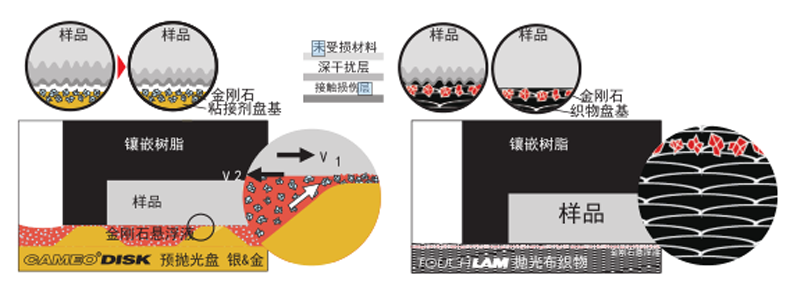 | 預拋時底部由硬質磨盤支撐,金剛石懸浮液只能磨薄表面接觸損傷層并且會產(chǎn)生新的變形層(深干擾層) | 預拋時底部由軟質織物支撐,金剛石懸浮液在消除表面接觸損傷層和變形層時不會產(chǎn)生新的變形層(深干擾層) |