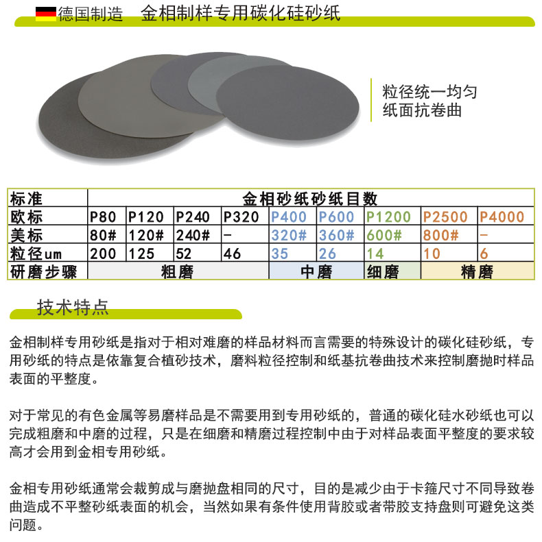 技術特點 金相制樣專用砂紙是指對于相對難磨的樣品材料而言需要的特殊設計的碳化硅砂紙,專用砂紙的特點是依靠復合植砂技術,磨料粒徑控制和紙基抗卷曲技術來控制磨拋時樣品表面的平整度。 對于常見的有色金屬等易磨樣品是不需要用到專用砂紙的,普通的碳化硅水砂紙也可以完成粗磨和中磨的過程,只是在細磨和精磨過程控制中由于對樣品表面平整度的要求較高才會用到金相專用砂紙。 金相專用砂紙通常會裁剪成與磨拋盤相同的尺寸,目的是減少由于卡箍尺寸不同導致卷曲造成不平整砂紙表面的機會,當然如果有條件使用背膠或者帶膠支持盤則可避免這類問題。 實測數(shù)據(jù)