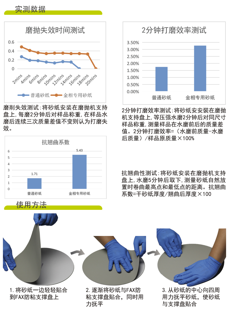 抗翹曲性測試:將砂紙安裝在磨拋機支持盤上,水磨5分鐘后取下,測量砂紙自然放置時卷曲最高點和最低點的距離??孤N曲系數(shù)=干砂紙厚度/翹曲后厚度×100 |