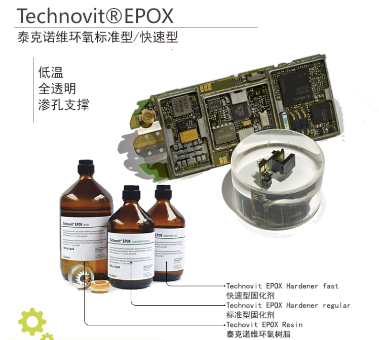 泰克諾維EPOX具備超高清晰度,極低的峰值溫度,更長的固化時(shí)間(更好的滲透和微孔包埋,可以在真空環(huán)境下,恒溫環(huán)境下或者冷藏環(huán)境下完成),尤其是多微孔的噴涂涂層或者是腐蝕層的透明包埋,完全無邊緣縫隙(合成了粘接系統(tǒng))等特點(diǎn)。