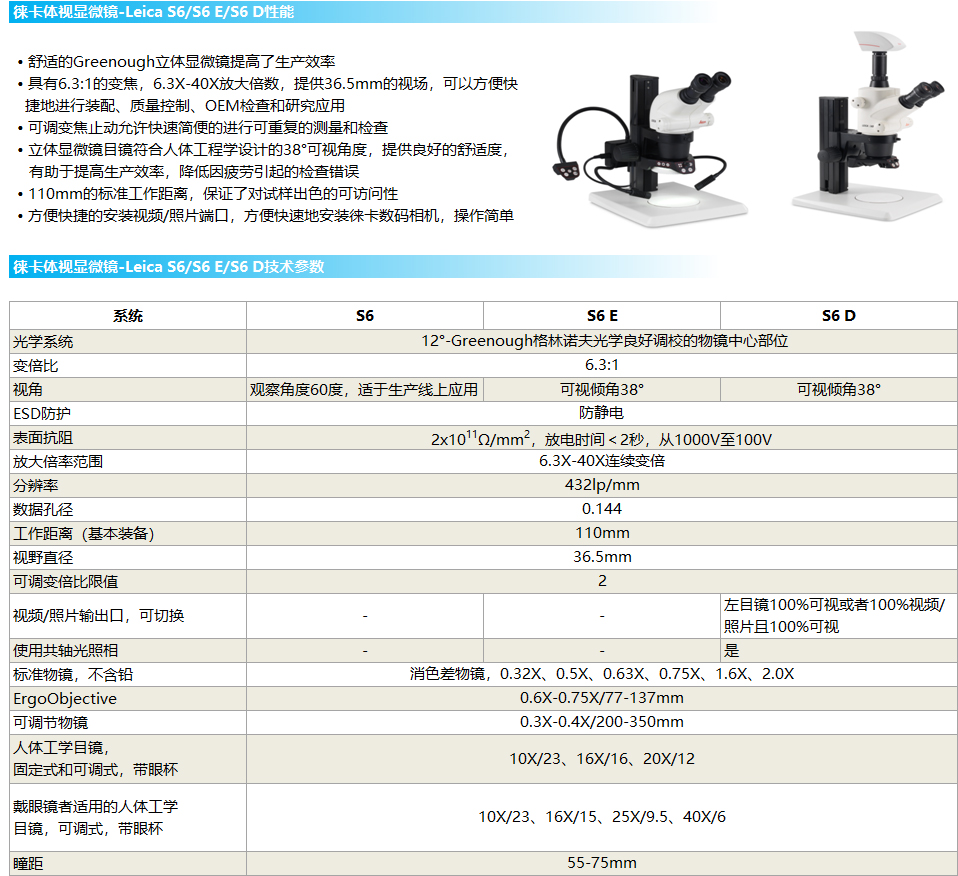 LeicaS6/S6E/S6D格里諾立體顯微鏡,具有6.3:1的變焦,可以方便快捷地進行裝配、質量控制、OEM檢查和研究應用??烧{變焦止動允許快速簡便的進行可重復的測量和檢查。36.5mm的大視場和高景深,減少了樣本的處理并提高了檢驗的次數(shù)。符合人體工程學設計的38°視角提供了舒適性,這有助于提高生產效率,降低因疲勞引起的檢查錯誤,并在進行入射光或透射光操作時獲得準確的定位。緊湊的設計非常人性化。